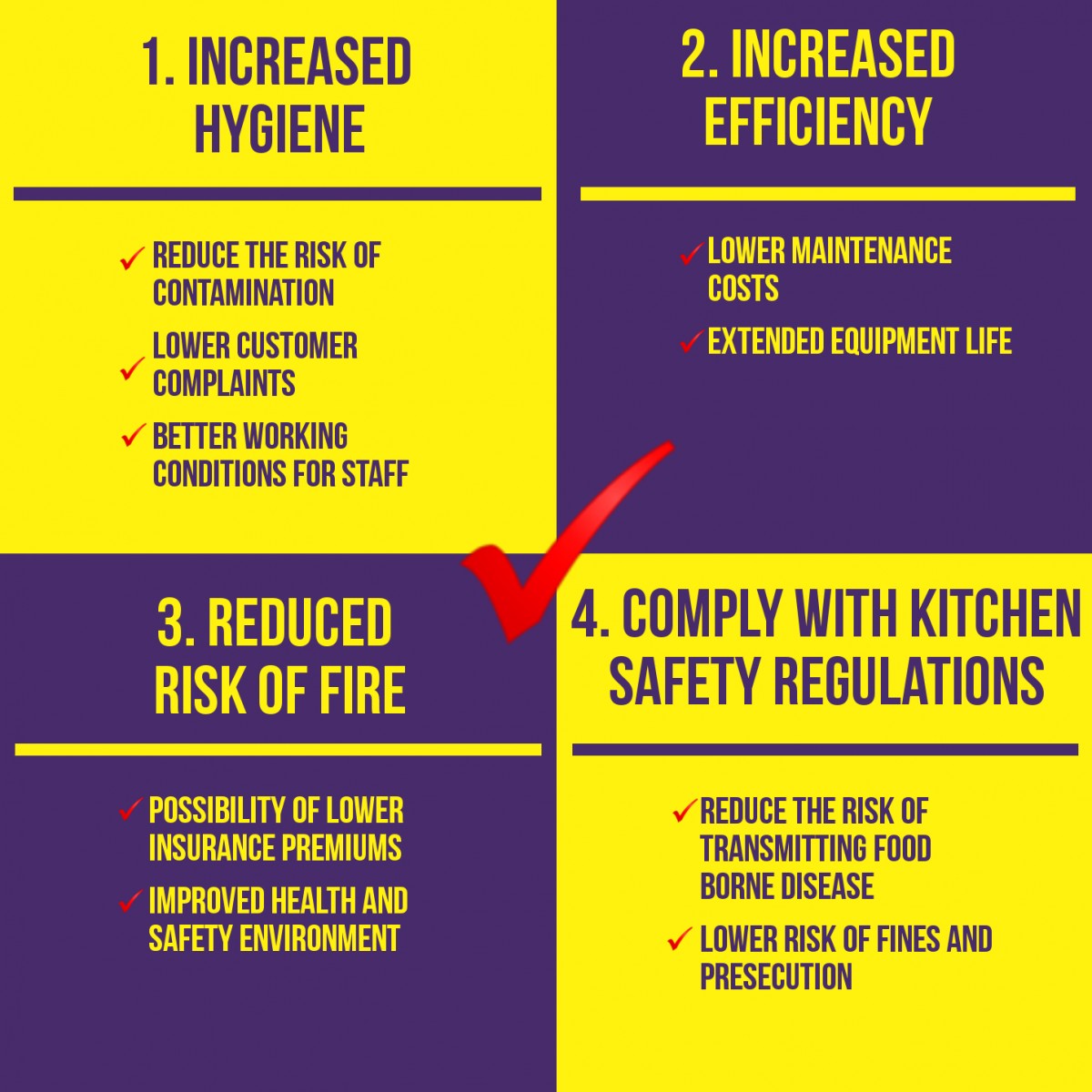 In Commercial Catering environments such as kitchens, canteens and food preparation areas, the gradual accumulation of grease and carbon deposits can lead to a high risk of cross contamination, as well as being a fire hazard.